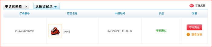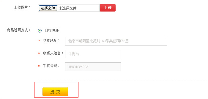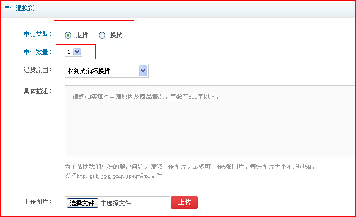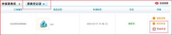 第三步:選擇”退貨“或者”換貨“,然后按要求填寫退換貨內(nèi)容,填寫完畢后點(diǎn)”提交“按鈕。 (備注:提交完畢后,”審核中“狀態(tài),用戶可以對(duì)提交信息進(jìn)行取消、修改)