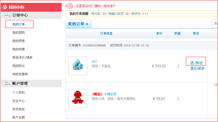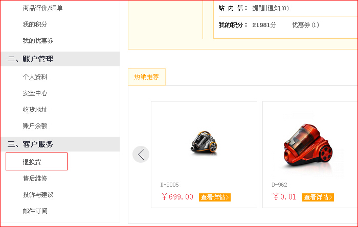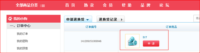 第二步:點(diǎn)擊“我的訂單“退換貨直接進(jìn)入退換貨頁面,或客戶服務(wù)下”退換貨“,點(diǎn)擊申請(qǐng)。