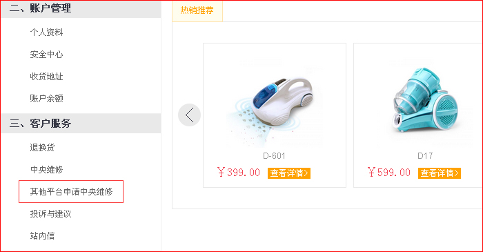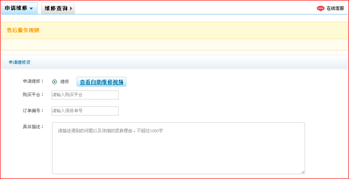 | 一、其他平臺(天貓、京東、蘇寧易購、國美、唯品會、當(dāng)當(dāng))申請售后維修 第一步:注冊官方商城賬號,注冊完成后,點擊“我的小狗”,進入個人中心頁面,若您已經(jīng)有商城賬號可直接登錄。(點擊查看:注冊登陸步驟) 第二步:點擊售后服務(wù)下“其他平臺申請售后維修”,進入非官方商城維修申請與查詢頁面。 ![]() 第三步:點擊“維修申請”,按提示填寫相關(guān)信息,填寫完畢后請仔細(xì)核對信息,沒問題點擊“保存”。 ![]() ![]() 第四步:申請審核通過后,我們會以短信的形式將維修單號發(fā)往您申請信息中預(yù)留的手機號上,您可在“維修查詢”中根據(jù)維修單號查詢維修進度。 ![]() 二、其他平臺(天貓、京東、蘇寧易購、國美、唯品會、當(dāng)當(dāng))維修查詢 第一步:注冊官方商城賬號,注冊完成后,點擊“我的小狗”,進入個人中心頁面,若您已經(jīng)有商城賬號可直接登錄。(點擊查看:注冊登陸步驟) 第二步:點擊售后服務(wù)下“其他平臺申請售后維修”,進入非官方商城維修申請與查詢頁面。 ![]() ![]() 第三步:將小狗短信推送您的維修單號輸入框內(nèi),填寫驗證碼,點擊“確定”即可查詢。 ![]() 三、手機端“售后維修申請與查詢” 第一步:注冊官方商城賬號,注冊完成后,點擊“我的小狗”,進入個人中心頁面,若您已經(jīng)有商城賬號可直接登錄。(點擊查看:注冊登陸步驟) 第二步:點擊“會員”,進入會員中心。點擊“售后維修-維修申請”進行維修申請;點擊“售后維修-查看維修進度”進行維修進度查詢。 |